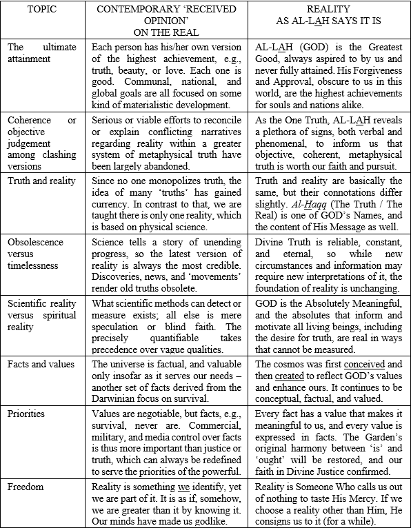 Before I go any further, a table of comparisons may help to clarify how radically opposed Qur’anic Reality is to what passes as reality in the media, the schools, and common conversation.
